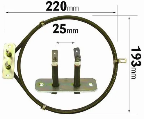 Also Known As: Circular Element, Round Element. 2 Turn. 2000 watts. Height: 215mm. Width 193mm. Bracket : 70mm. Tags: 24mm. If your fan oven is no longer heating up or not heating up at all, then you may have a fault with the heating element. With this top quality replacement you can help get your oven back to its best and get back to cooking those amazing dishes.